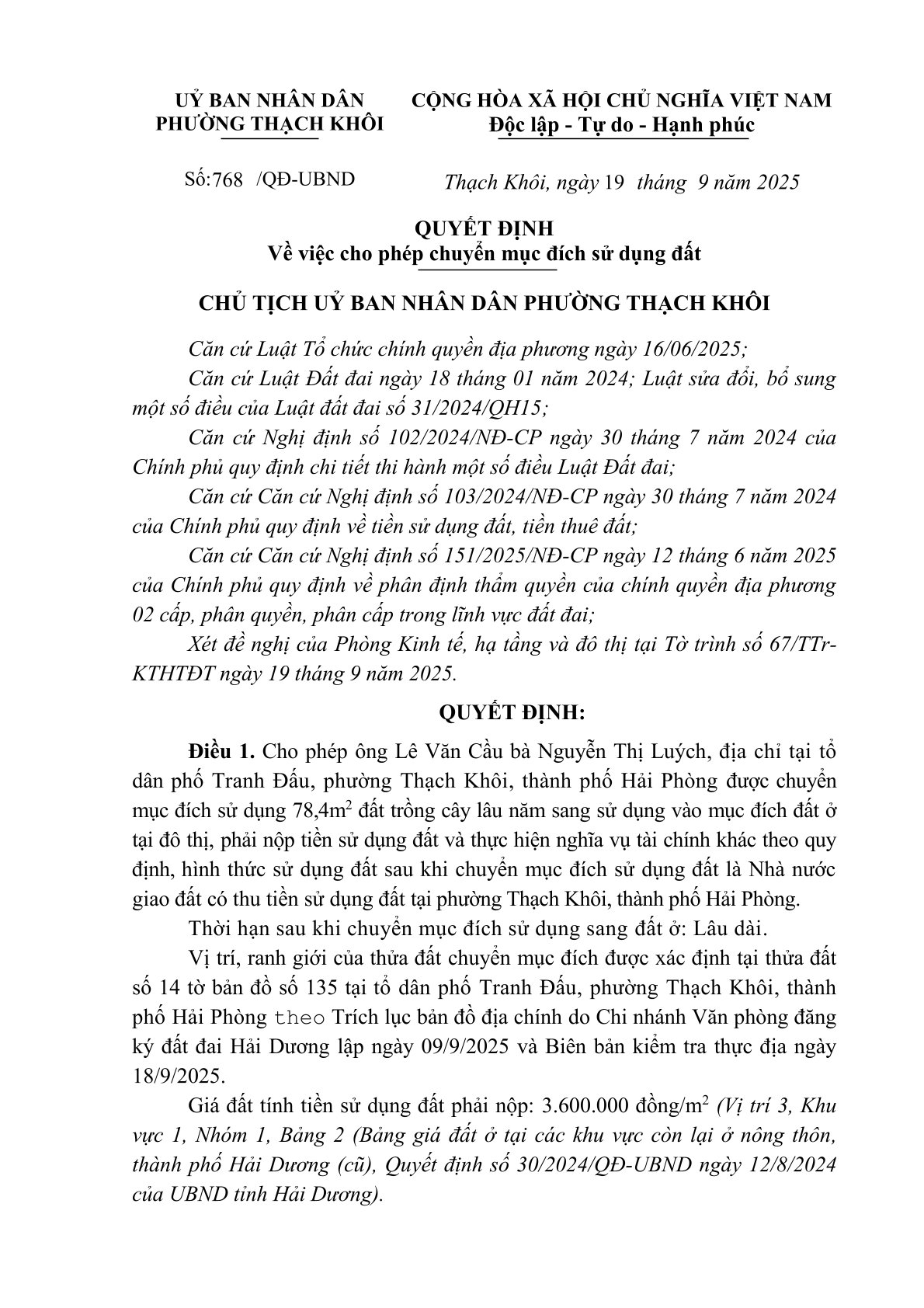 Quyết định về việc cho phép chuyển mục đích sử dụng đất đối với ông Lê Văn Cầu và bà Nguyễn Thị Luých, tại tổ dân phố Tranh Đấu, phường Thạch Khôi