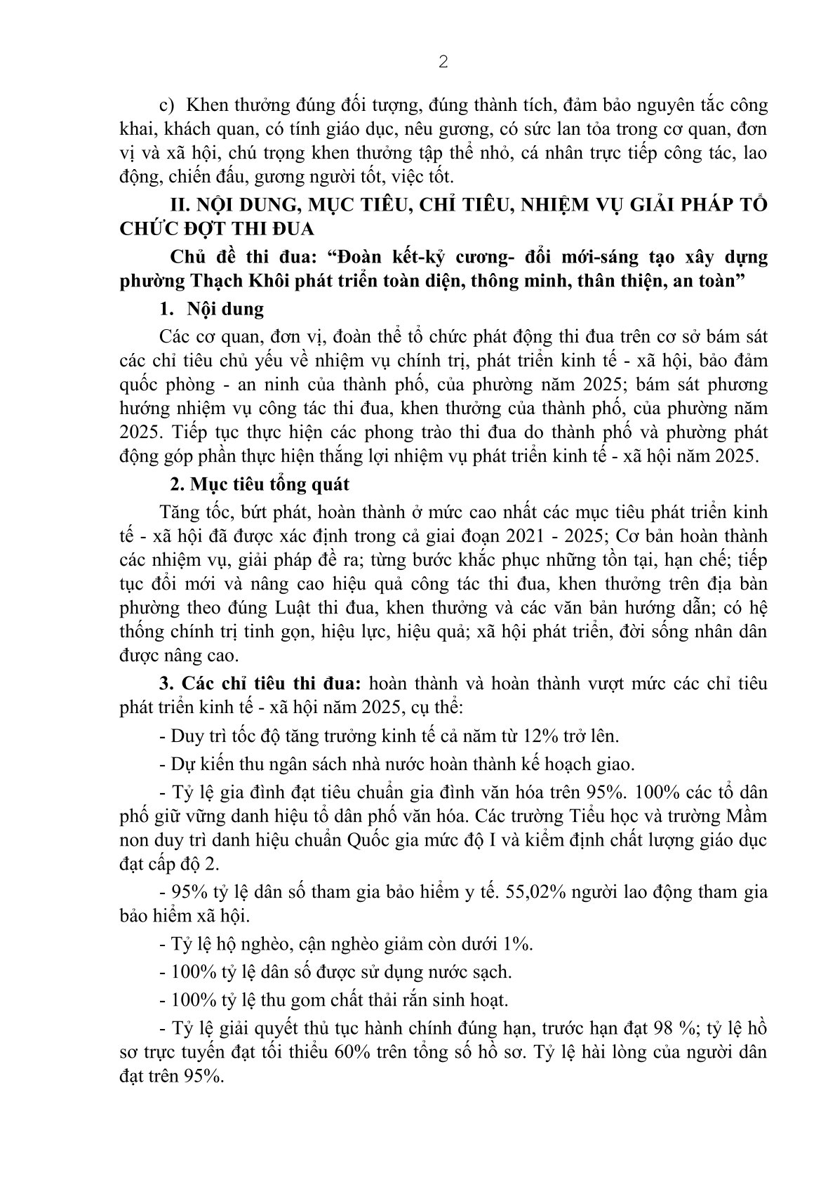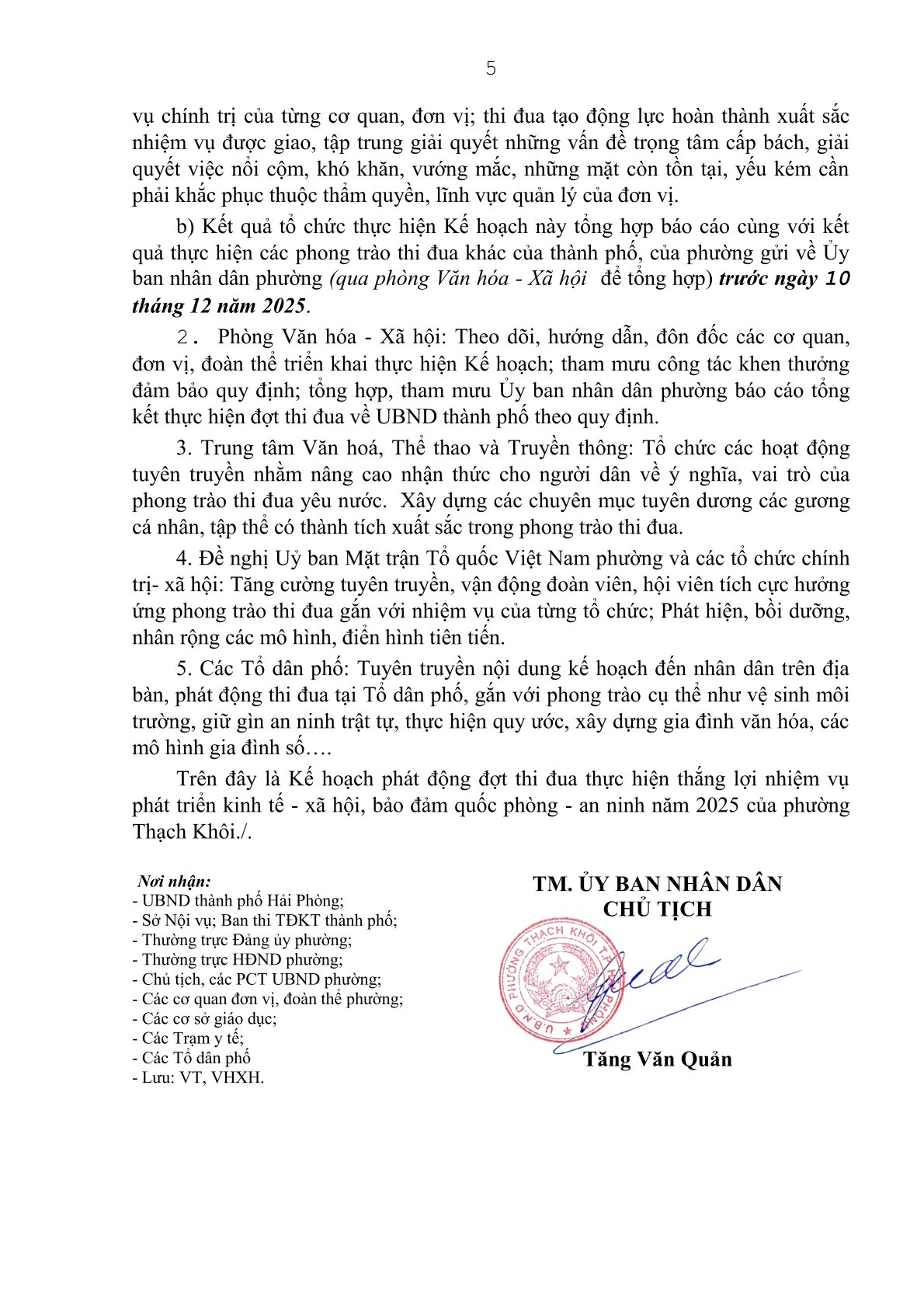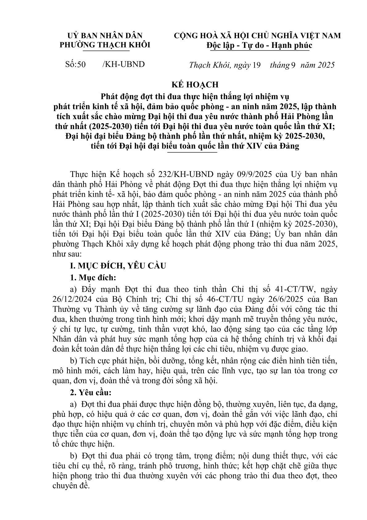 Phường Thạch Khôi phát động đợt thi đua thực hiện thắng lợi nhiệm vụ phát triển kinh tế xã hội, đảm bảo quốc phòng - an ninh năm 2025, lập thành tích xuất sắc chào mừng Đại hội thi đua yêu nước thành phố Hải Phòng lần thứ nhất (2025-2030) tiến tới Đại hội thi đua yêu nước toàn quốc lần thứ Xi; Đại hội đại biểu Đảng bộ thành phố lần thứ nhất, nhiệm kỳ 2025 - 2030, tiến tới Đại hội đại biểu toàn quốc lần thứ XIV của Đảng