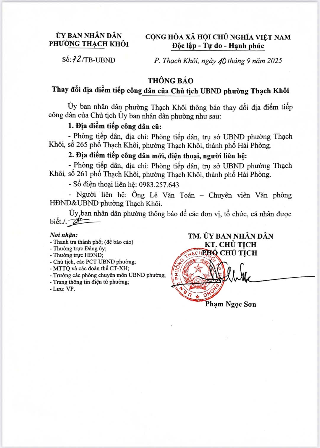 Thông báo thay đổi địa điểm tiếp công dân của Chủ tịch UBND phường Thạch Khôi