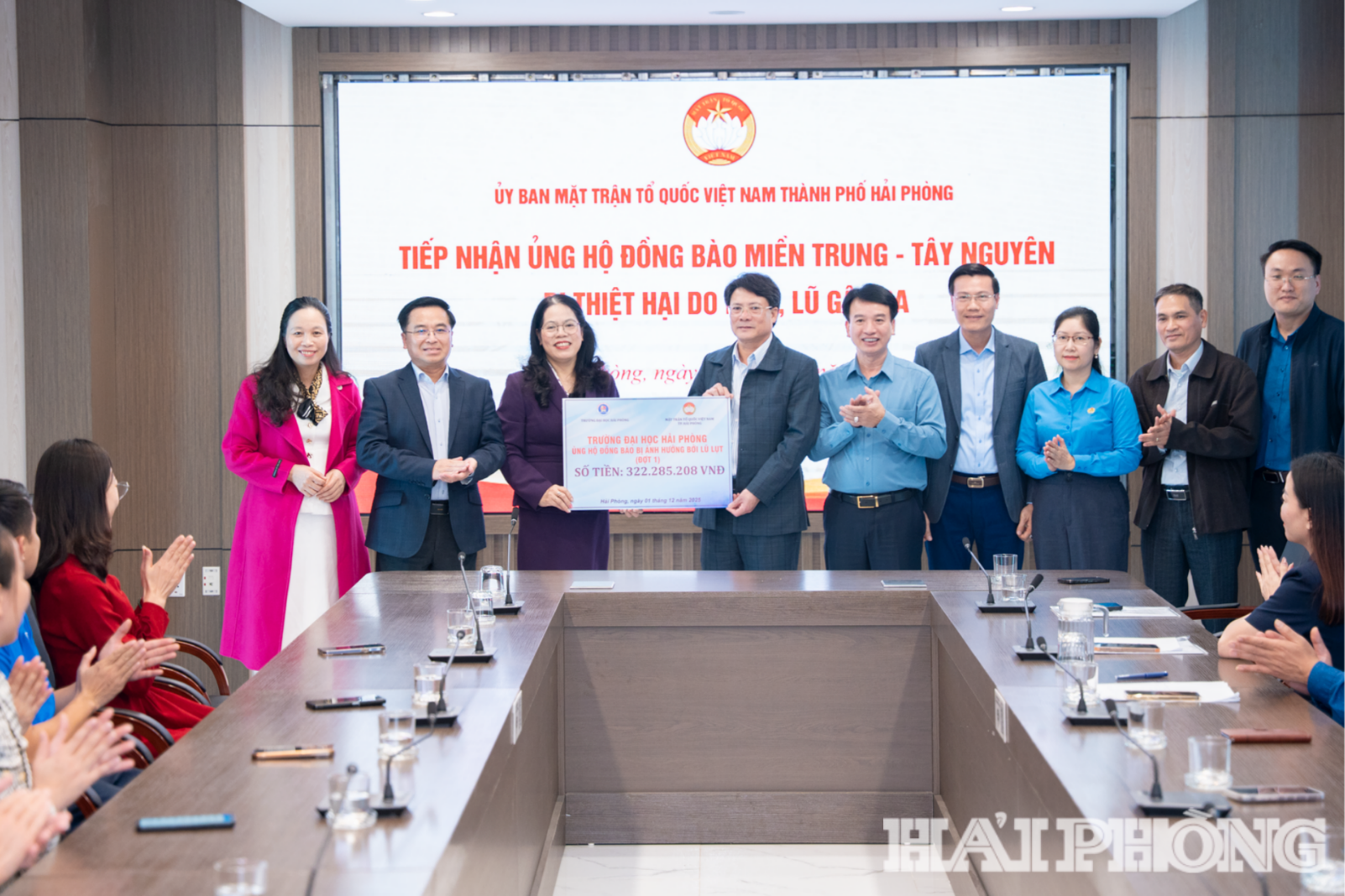 Đại diện Trường Đại học Hải Phòng trao kinh phí ủng hộ đồng bào miền Trung - Tây Nguyên bị thiệt hại do bão lũ.