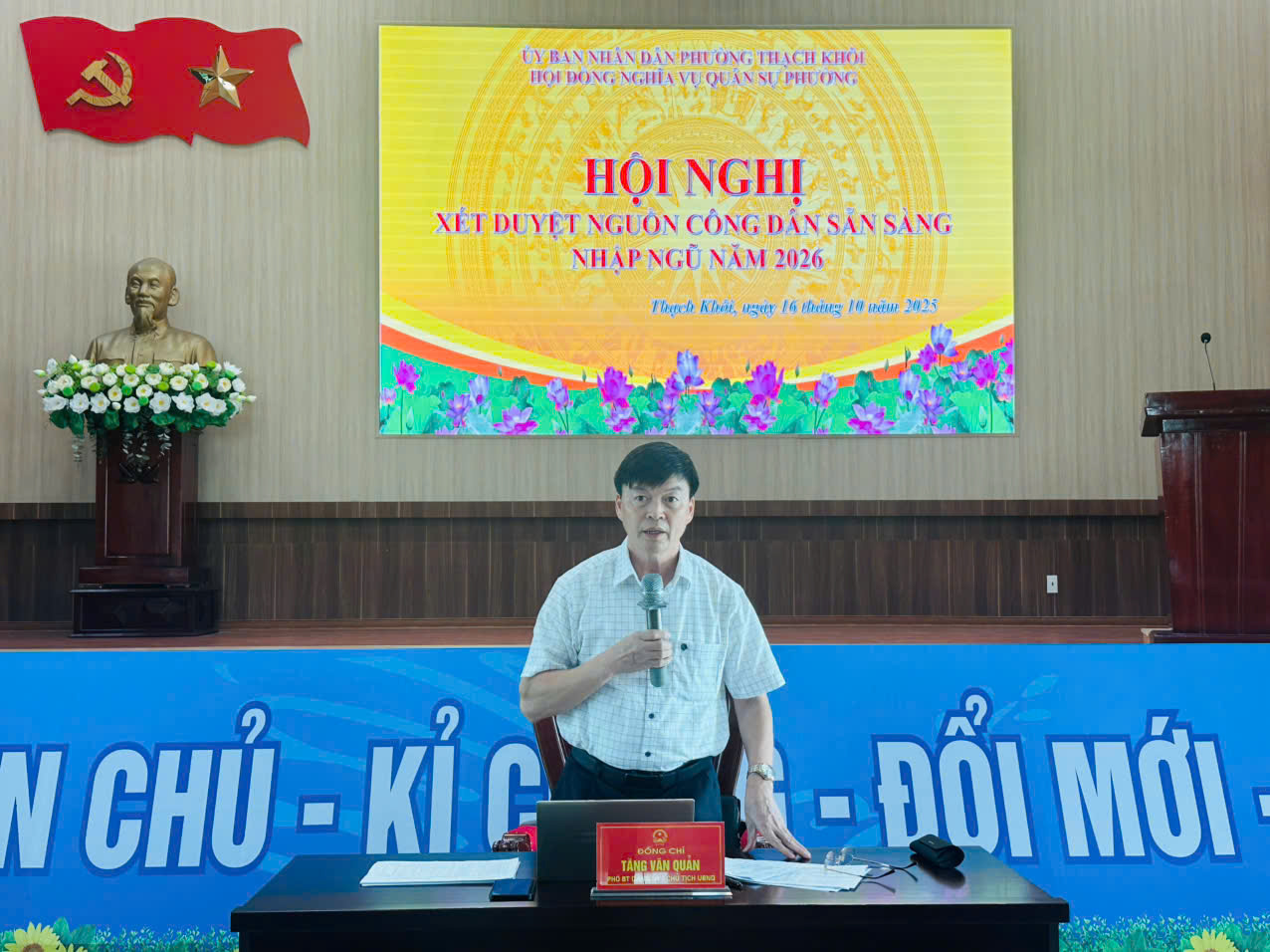Chiều 16/10, UBND phường Thạch Khôi tổ chức Hội nghị xét duyệt nguồn công dân sẵn sàng nhập ngũ năm 2026. Đồng chí Tăng Văn Quản – Phó Bí thư Đảng uỷ, Chủ tịch UBND phường chủ trì hội nghị.