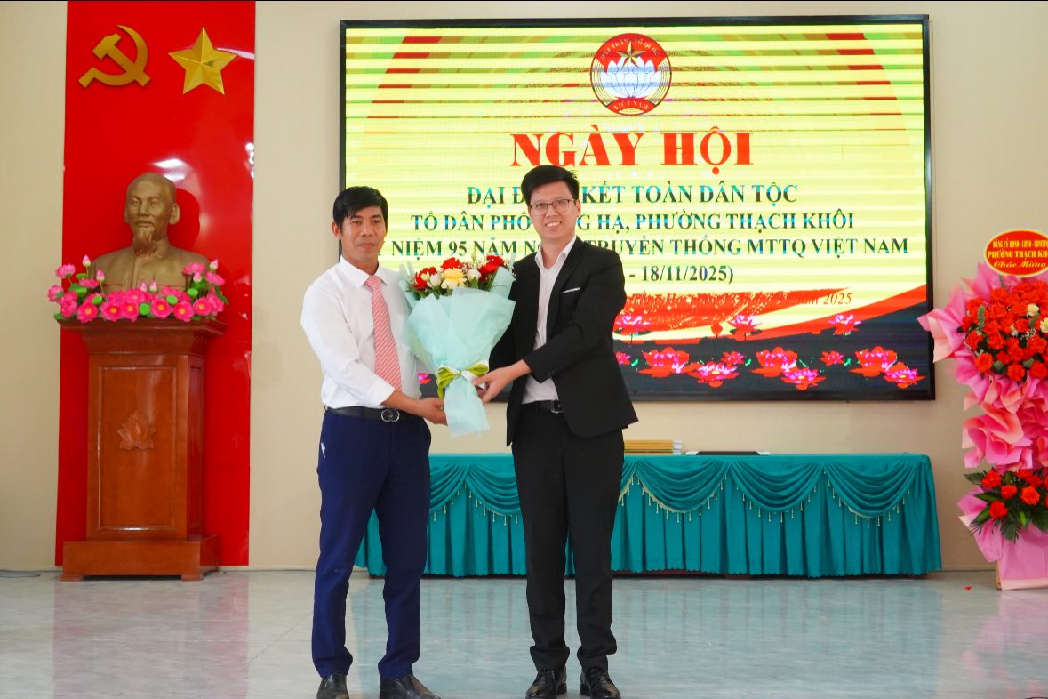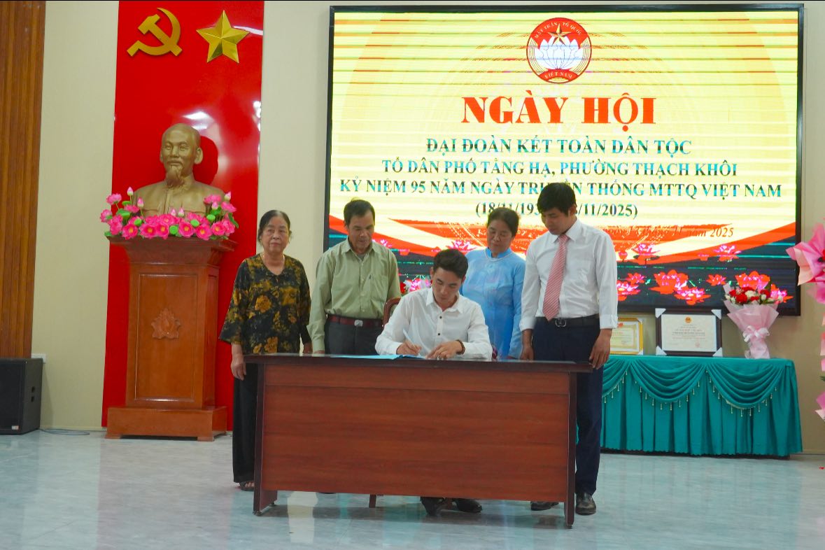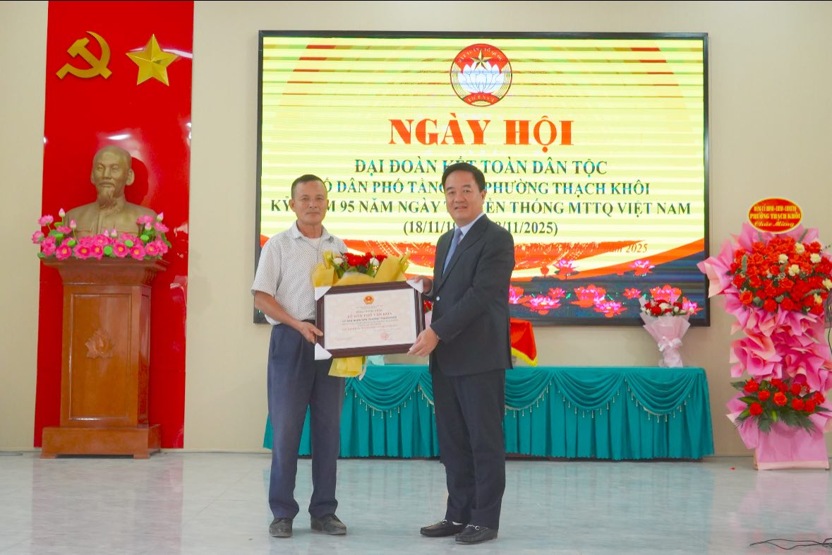 Ngày 13/11, Tổ dân phố Tằng Hạ - đơn vị đầu tiên của phường Thạch Khôi tổ chức Ngày hội Đại đoàn kết toàn dân tộc nhân dịp kỷ niệm 95 năm Ngày Truyền thống MTTQ Việt Nam (18/11/1930 - 18/11/2025). Tới dự và chung vui với cán bộ, đảng viên và nhân dân Tổ dân phố, có đồng chí Nguyễn Văn Kiên - Bí thư Đảng uỷ, Chủ tịch HĐND phường; các đồng chí trong Ban Thường vụ Đảng ủy, Thường trực HĐND, lãnh đạo UBND, Uỷ ban MTTQ phường.