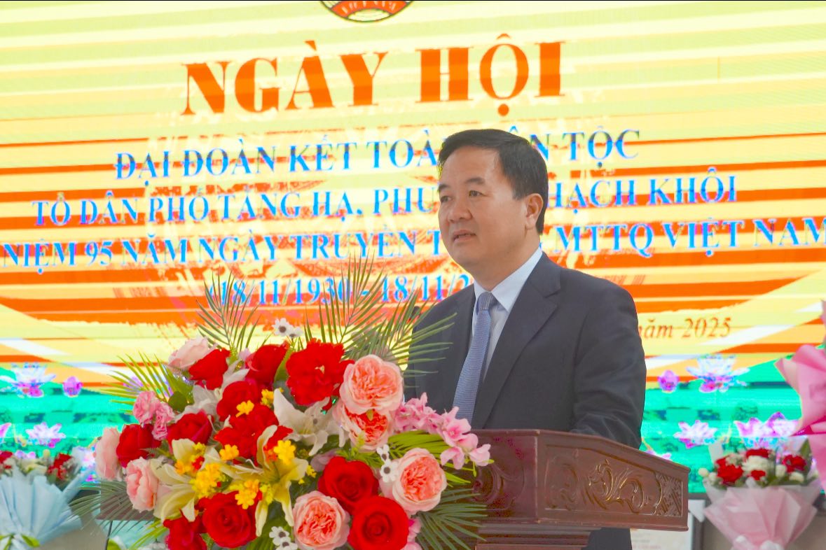 Phát biểu tại ngày hội, đồng chí Nguyễn Văn Kiên - Bí thư Đảng uỷ, Chủ tịch HĐND phường ghi nhận, biểu dương những kết quả nhân dân Tổ dân phố Tằng Hạ đạt được; đồng thời, đề nghị cán bộ và nhân dân Tổ dân phố tiếp tục phát huy truyền thống Đại đoàn kết toàn dân tộc, triển khai thực hiện các mục tiêu Đại hội Đảng bộ phường lần thứ I, nhiệm kỳ 2025 -2030 đã đề ra; giúp nhau phát triển kinh tế, xây dựng đời sống văn hóa, tích cực vận động nhân dân tham gia hiến đất, mở rộng đường giao thông, xây dựng cơ sở hạ tầng, góp phần xây dựng phường Thạch Khôi là phường văn minh, kiểu mẫu.